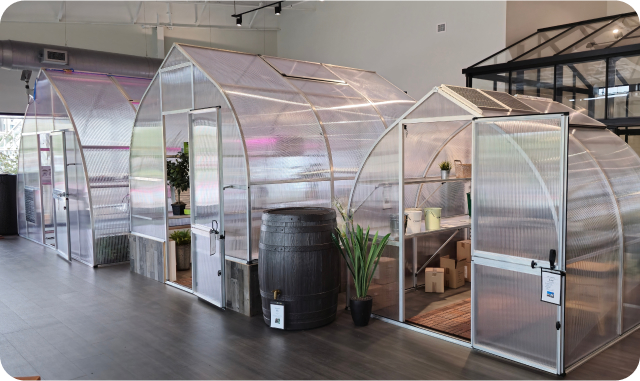 We also serve retail customers locally in central Texas! Our new warehouse and showroom is located in Pflugerville (just outside of Austin), and displays 11 greenhouse models and a variety of our small garden products. Come visit us and see our products in person!