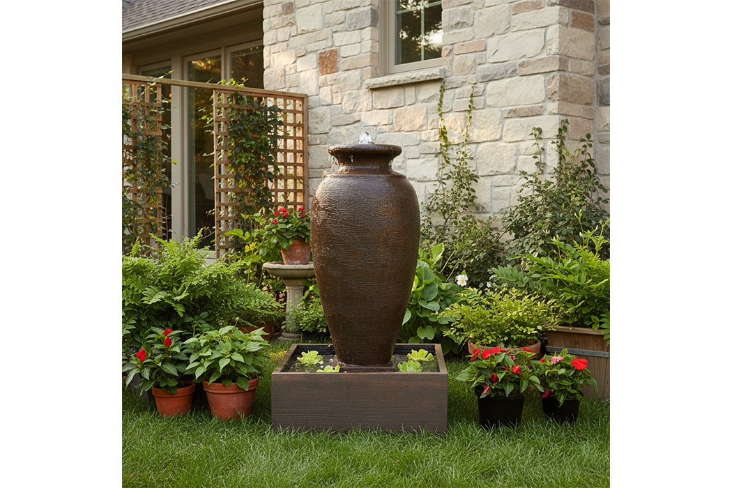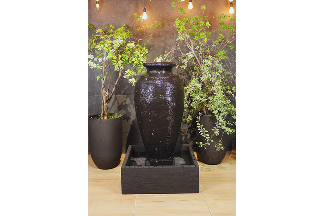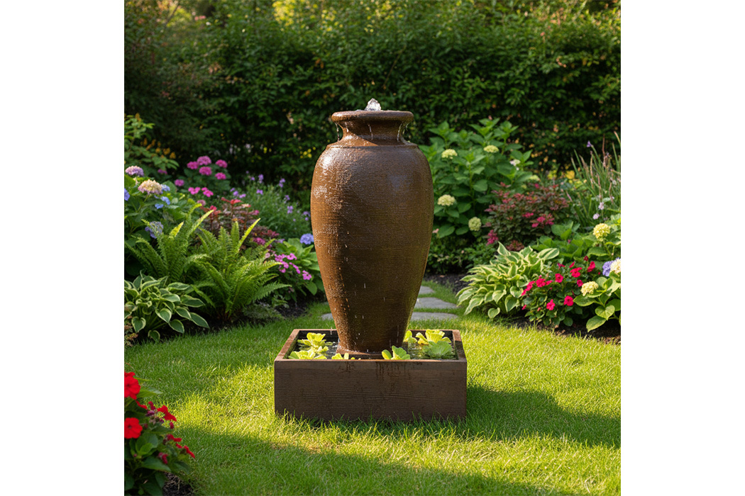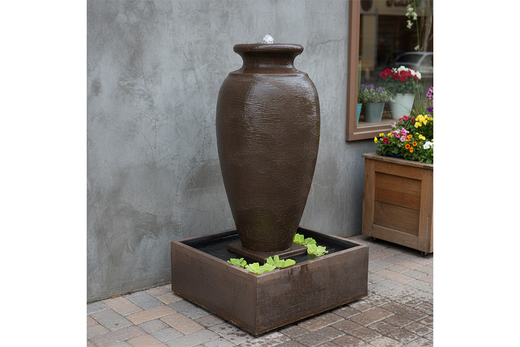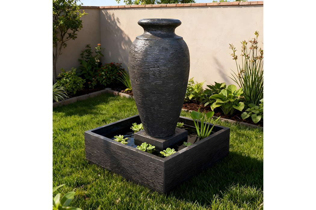 Water flows softly over the vessel, producing a calming sound that enriches courtyards, meditation areas, garden paths, and gathering spaces. The included LED light adds a warm glow at night, bringing the fountain to life after dusk. Whether installed in a residential garden, hospitality setting, or designed landscape, the Amphora Fountain offers enduring beauty and reliable performance that will last for years.
