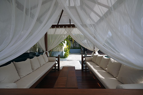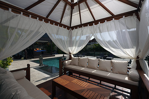 It includes a table and two long benches with beautiful white outdoor cushions and mosquito netting. The cushions and roof cover are made from long-lasting Sunbrella material.