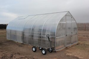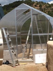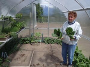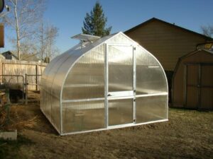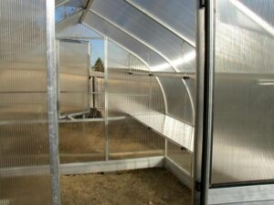 "We live on the eastern side of the Sierras where the wind "blows the sun away." The winds come over the mountain and can be quite ferocious, on a regular basis, every year, and we have seen heavy, heavy snow. Our Riga has survived 100-mile-an-hour winds here and has gone through numerous windstorms without a problem until we had a 120-some mile an hour storm in January. Then the wind caught the door and broke the hinges. Now that I have the metal hinges for the door it should be fine. It has also nicely survived heavy snows here; the snow slides off the roof. When we were looking online to find a greenhouse that would survive our climate, we ran across your website showing your husband standing straddling the peak, and we knew we had found what we were looking for. I can't remember what year we bought it, somewhere around 2007, and it has gone through everything nature could throw at it so far. I have put up garden-style lattice-work on steel poles on the windward side to help shield it somewhat from the wind, which has helped somewhat too. Your product is truly a step above the rest.Other greenhouses in this area have not fared as well. I have even tried to steer people who were in the market to buy greenhouses to the Riga. Again, thank you for your excellent product."