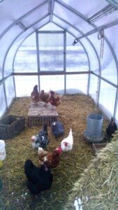 We use an electric dog water bowl and the chicken feeder hangs from the ceiling frame. A 2x4 spans the rear of the coop for roosting. In the spring all doors and vents need to be open else it gets too hot. We had custom cut aluminum panels to change the front door from solid panels to something more like a fence (chickens need fresh cool air). Also, we hung chicken wire over the back window so that can be open in the summer. Through the winter we just let the deep bedding straw and compost mixture build up and mix it with our boots every so often..... easy, no coop to clean. When we sold our house, 3 adults lifted the greenhouse, put it on a trailer and towed it to our new location (~25mph). Great product, great for chickens in the winter! Assembly took 1.5 days by myself, would be a lot faster with 2 people. Soon we hope to use it as a real greenhouse."