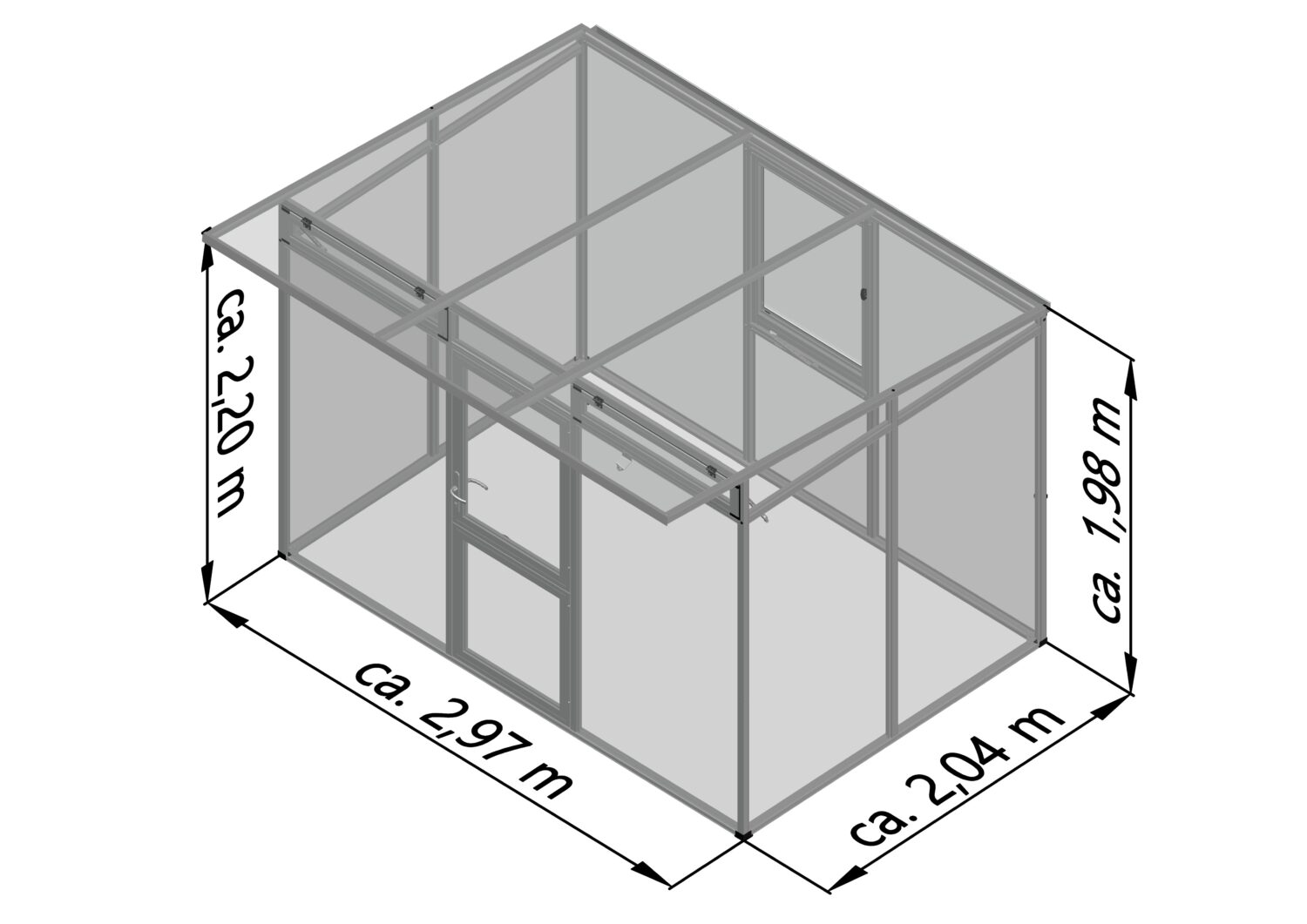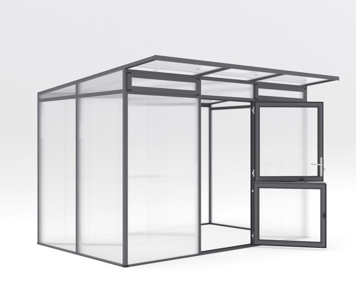 The rugged big sister to the Linea, The Santini II greenhouse offers many of the same features, but with thick 16mm triple-wall polycarbonate for added insulation. Sleek modern shape and anthracite gray framing will appeal to a wide variety of urban backyards. Works well as a greenhouse or a lockable storage shed for bikes and other equipment.